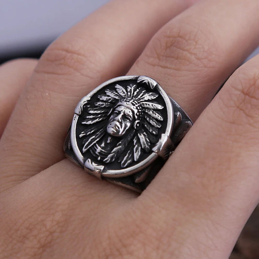 Native American Indian Chief Mens Signet Ring - Stainless Steel Silver - Unisex