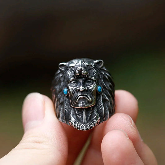 Native American Indian Chief Ring with Bear Headdress Mens Turquoise Ring - Stainless Steel Silver - Unisex
