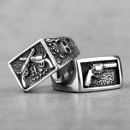 Skull Gun Cowboy Ring Mens - Stainless Steel Silver - Unisex