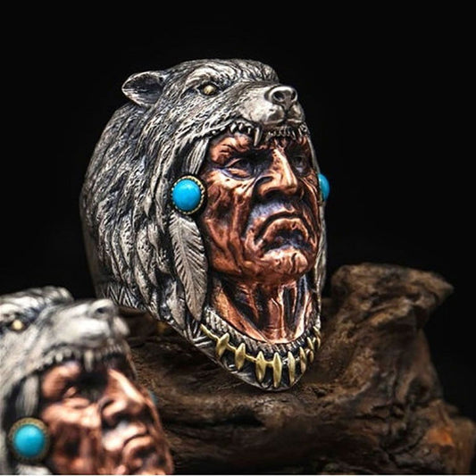Turquoise Bear Native American Indian Chief Ring Mens - Silver, Gold, Bronze & Turquoise - Unisex