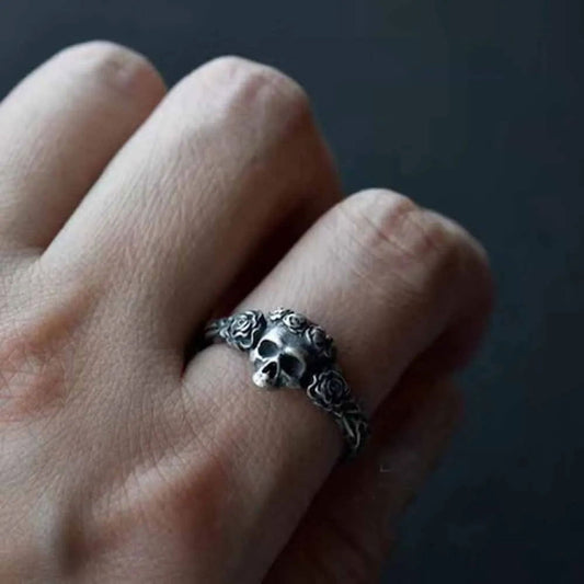 Gothic Flowers and Roses Skull Ring - Stainless Steel Silver - Unisex