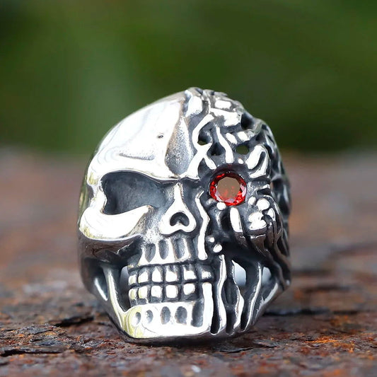 Melting Skull Cyborg Red Eye Terminator Ring Mens - Stainless Steel Silver - Unisex