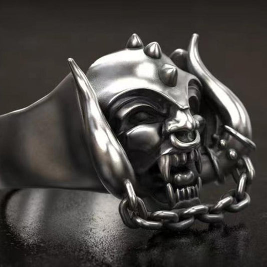 Horned Satanic Skull Ring Mens - Stainless Steel Silver - Unisex
