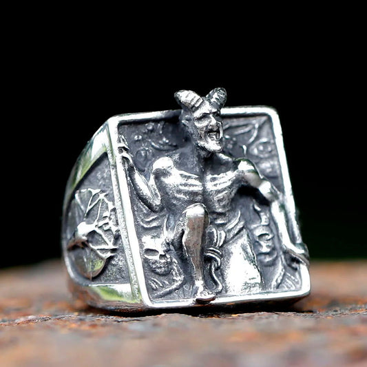 Satanic Skull Baphomet Ring Mens Devil Lucifer - Stainless Steel Silver - Unisex