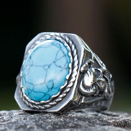 Turquoise Skull Snake Gemstone Mens Ring - Stainless Steel Silver - Unisex