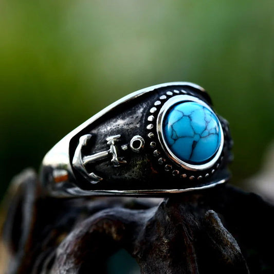 Viking Anchor Mens Turquoise Ring - Stainless Steel Silver - Unisex